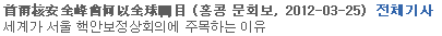 2012년 3월, 서울에서 개최된 "2012 서울 핵안보정상회의"는 전세계 50여 정상 및 국제기구 수장이 참가해 테러집단으로부터 핵물질·시설을 방호하기 위한 국제적 협력방안을 논의한 안보분야 최대 규모의 정상회의입니다. 회의에서 논의된 주요 아젠다는 아래와 같습니다.